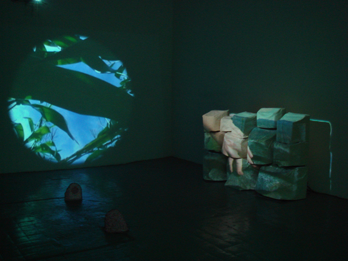2 video wall projections, audio on sculpted speakers, a video projection on televisions fitted with canvas covers and stacked and to resemble a stone wall. 20’ x 24’.